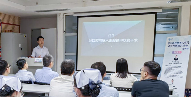 術后李杰華教授帶來了精彩授課,介紹了主流腔鏡入路和機器人技術在甲狀腺癌手術的應用,并分享了關于經口腔前庭入路腔鏡下甲狀腺手術的手術經驗交流及最新研究進展。