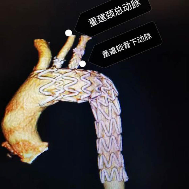 面對(duì)兩難選擇,柳州市人民醫(yī)院血管外科霍鑫博士帶領(lǐng)科室介入團(tuán)隊(duì)經(jīng)過(guò)仔細(xì)評(píng)估,制定了精細(xì)的手術(shù)方案,做好充分的術(shù)前準(zhǔn)備,并憑借精湛的醫(yī)術(shù)、精準(zhǔn)的操作,成功運(yùn)用胸主動(dòng)脈平行支架+開(kāi)窗技術(shù),全腔內(nèi)修復(fù)了主動(dòng)脈弓部病變,重建了頸總動(dòng)脈+鎖骨動(dòng)脈。既完全封閉了潰瘍破口,又保留了重要分支動(dòng)脈的血液供應(yīng),達(dá)到了理想的治療效果。