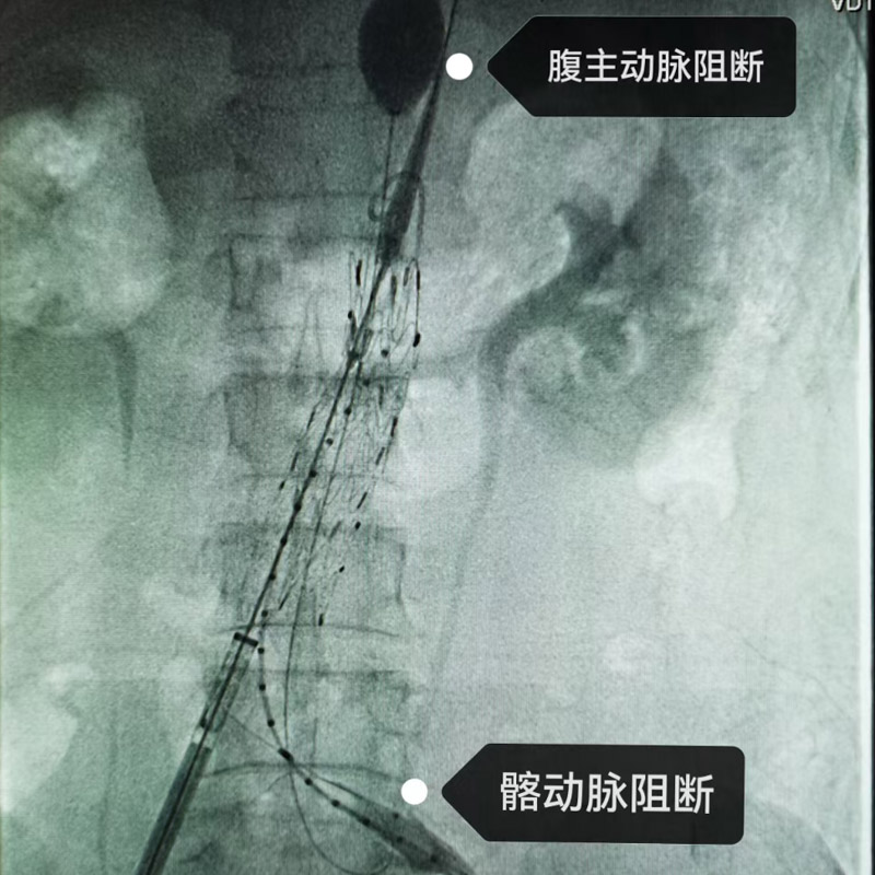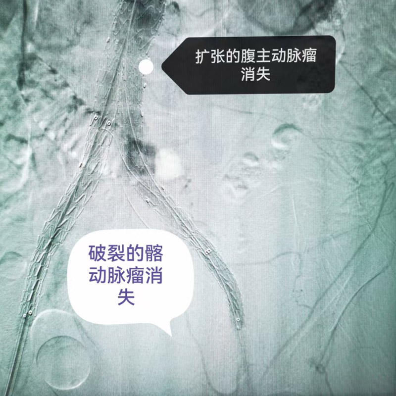 醫生當機立斷,以最快速度消毒、鋪巾,穿刺患者左肱動脈及左股動脈,熟練使用球囊導管阻斷破裂的左髂總動脈近端腹主動脈及遠端股動脈。隨著破裂髂動脈的阻斷,以及血管活性藥的配合使用,患者的血壓逐步上升至正常水平。隨后,醫生順利將腹主動脈支架及髂動脈支架植入,隨著手術的成功,醫護人員一顆懸著的心終于放了下來。