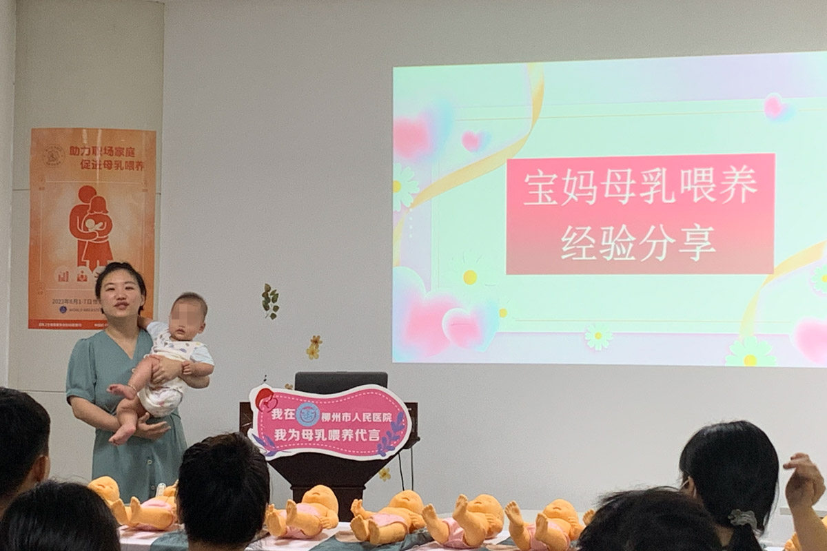 一位在柳州市人民醫院生產的寶媽帶著她七個月齡的寶寶回來分享她的母乳喂養經驗,她談到寶寶剛開始不愿意吮吸母乳時的焦慮,導致自己堵奶很嚴重,被胸前又硬又痛的“石頭奶”折磨了好久,多次到產科門診進行乳腺疏通和母乳喂養咨詢后,堵奶和寶寶不吮吸母乳的問題得到了解決。她也因此感受到了母乳喂養有助于建立母子感情的幸福,她呼吁準爸爸關注準媽媽的心情,體諒和支持母乳喂養的媽媽。