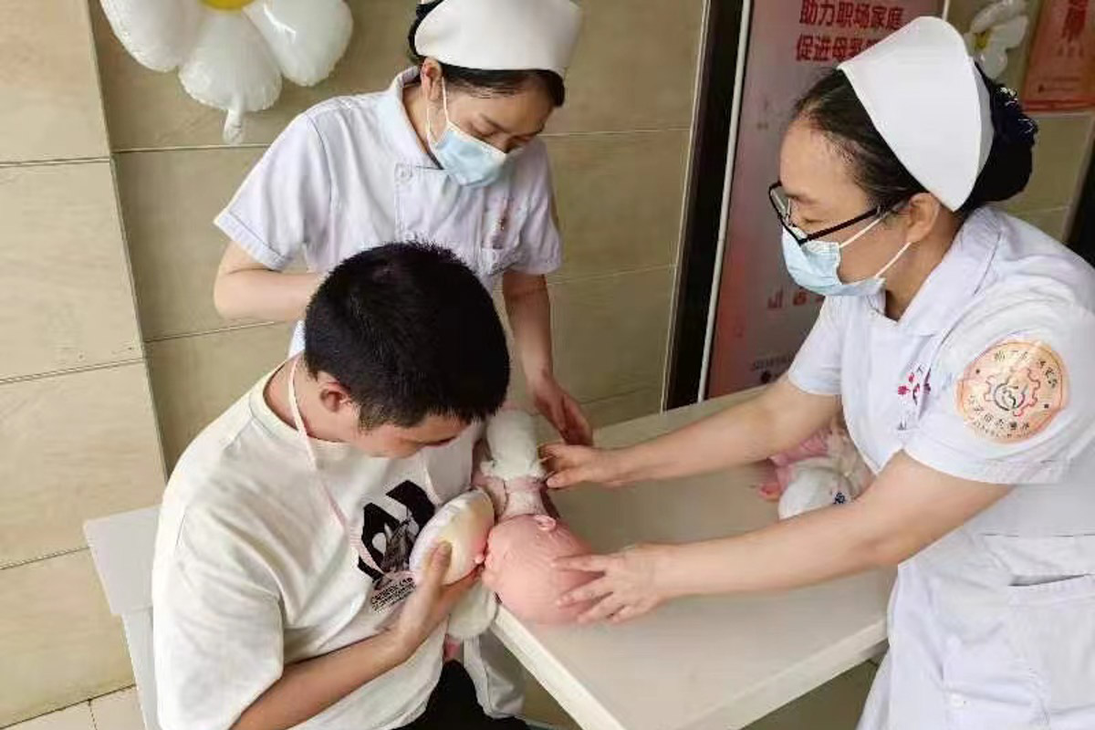 醫護人員帶領大家一起讀新生兒撫觸速記順口溜,手把手教大家科學做新生兒撫觸。在場的準爸爸爭先上臺比拼,場下的準爸爸也拿著寶寶模型不停地練習。