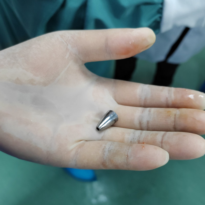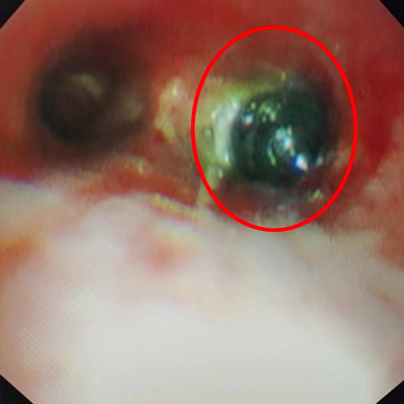 經過術前縝密討論及模擬,在多學科協同配合下,施術醫生小心松解嵌頓的筆頭套后精準調整異物位置,緩慢將筆套頭套入氣管導管尖端后與氣管導管一并退出氣管、聲門,順利取出異物!