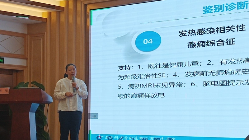 本次病例比賽的參賽單位來自南寧、柳州、桂林、百色、梧州等各大醫院。比賽中,她講述了一位13歲的健康女孩,突然出現發熱和頻繁抽搐,從當地衛生院轉至柳州市人民醫院兒科,患兒住院期間出現了持續癲癇狀態,兒科團隊通過周密檢查,抽絲剝繭,最終確診為發熱感染相關性癲癇綜合征。