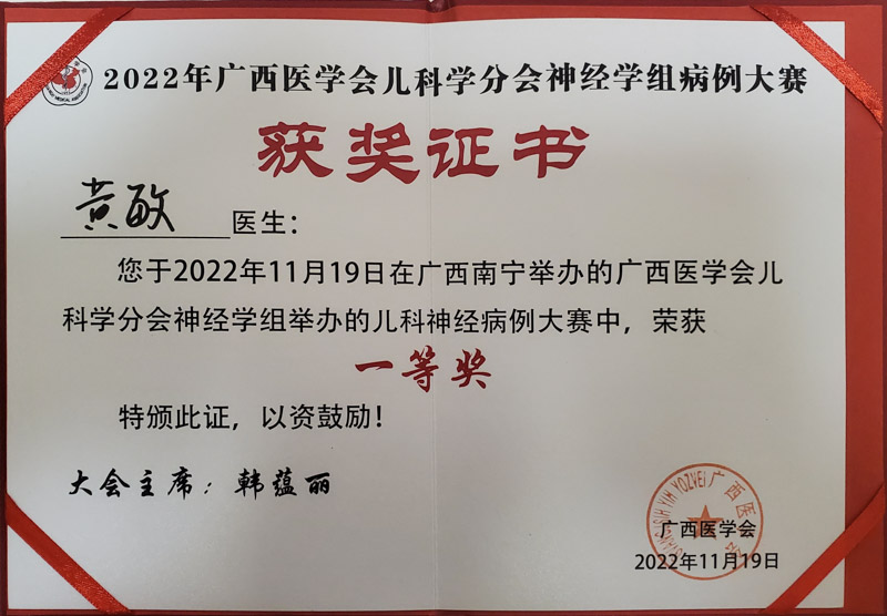 近日,2022年廣西醫學會兒科學分會神經學組學術年會暨兒科神經病例大賽在南寧順利舉行。柳州市人民醫院兒科副主任醫師黃敏以精彩的演講和出色的表現得到評委專家們的一致好評,奪得比賽一等獎!