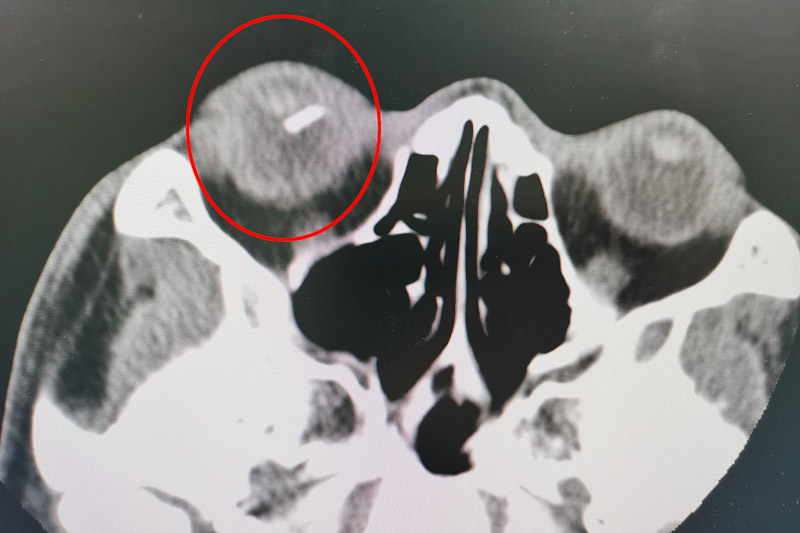經檢查,發現患者右眼眼球已被穿通,眼球內還殘留有玻璃體異物,目前患者視物不清,只有光感,情況十分危急。眼科團隊針對該患者的情況立刻開展了術前討論,一致認為可以通過玻璃體切割術清除玻璃體內的積血及機化組織并摘除異物,保住患者的眼球及視力。