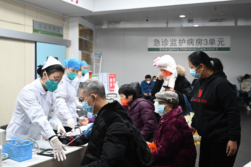 在這個特殊時期里,急診醫學科每個診室門口都圍滿了患者和家屬。來就診的患者中,大多是老年人,其中不少都罹患較為嚴重的基礎疾病。與此同時,在崗醫護人員也強忍發燒咳嗽,連日來都是處于高負荷運轉的狀態。