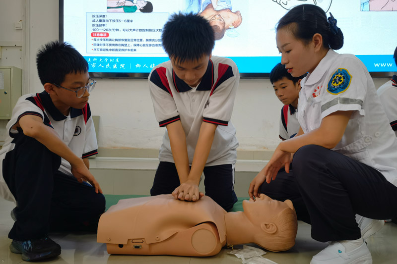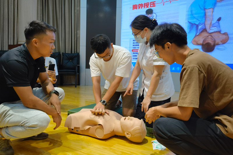 “定位在兩乳頭連線(xiàn)中點(diǎn),雙臂伸直,雙手掌重疊,掌心向下,01,02,03……”在隨后的實(shí)踐操作環(huán)節(jié),醫(yī)護(hù)人員手把手指導(dǎo)同學(xué)們進(jìn)行急救方式練習(xí)并掌握操作要領(lǐng),并對(duì)操作中不到位的地方進(jìn)行指正。