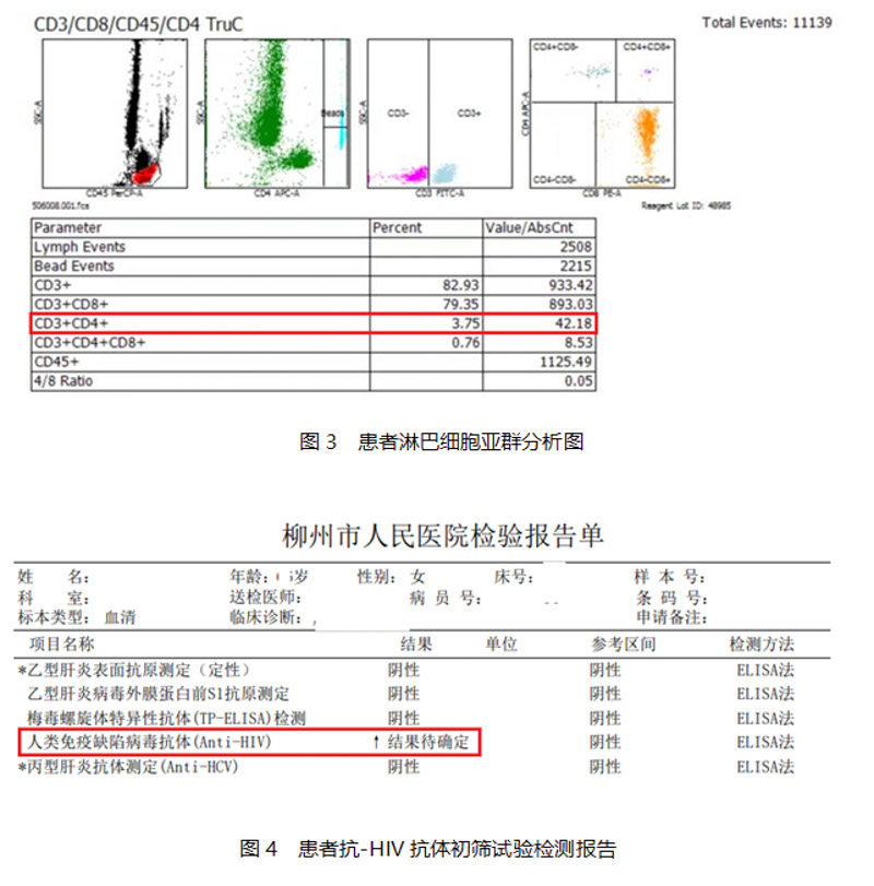 明確為真菌感染后,抗真菌治療一個月,然而真菌感染情況并沒有得到有效控制,潰瘍情況好了又壞,看來真菌感染只是幫兇,真正兇手是讓患者的免疫功能缺失,才讓真菌們有機可乘。經過進一步的檢驗,真兇的蛛絲馬跡才顯露出來,患者CD4+淋巴細胞明顯減少,CD4+/CD8+T淋巴細胞倒置(如圖3所示),存在明顯的免疫功能缺陷,而患者的HIV抗體初檢結果為待確定(如圖4所示)。