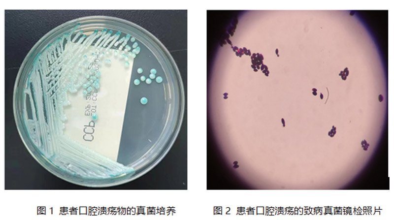 患者,女性,44歲,因口腔嚴重潰瘍反復發作來我院就醫。口腔科醫生認真細致查看了患者口腔情況,不由地倒抽一口涼氣,只見數個拇指大小的灰白色潰瘍布滿了患者口腔,醫師立即從潰瘍面上取下少量白色組織送檢。醫學檢驗科微生物實驗室的“偵探們”在顯微鏡下找到了口腔潰瘍的兇手-白色念珠菌!(如圖1、圖2所示)