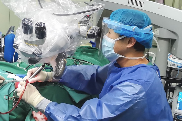 拿著鋒利的手術器械在顯微鏡下操作,稍有不慎,就可能傷到手造成職業暴露,所以手術團隊進行每一步操作都異常謹慎,正常2-3個小時的手術用了4個半小時,終于在晚上九點按術前計劃成功切除了臨近腦組織的“定時炸彈”,同時重建聲音傳導的通路,解除了常先生多年的頑疾。
