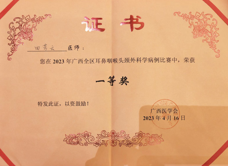 4月16日,廣西醫學會耳鼻咽喉頭頸外科2023年學術年會在南寧舉辦,在期間進行的病例比賽中,柳州市人民醫院耳鼻咽喉科田芳云醫生與來自全區各大醫院的優秀選手同臺競技,最終脫穎而出,榮獲病例大賽一等獎。