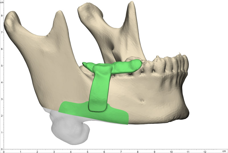 為保障患者安全,在多次病例討論后,口腔科手術團隊做了多次術前評估,并設計了精密的3D打印截骨導板。術中,劉彥杰醫生利用導板引導精確進行截骨,順利從口內將腫物切除。