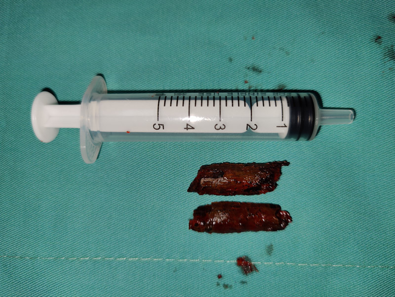 術中,口腔頜面外科團隊自面部將原傷口切開,見大量膿液噴涌而出,傷口深,視野差,大大增加了異物取出的難度,如果異物清除不干凈,會導致創口內持續發炎,導致二次手術。