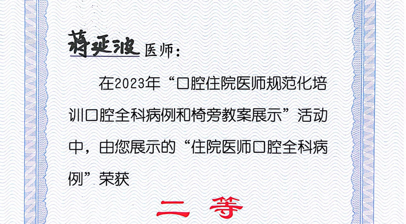 蔣延波醫(yī)師表示,這次比賽對自己來說既是鼓勵又是鞭策,離不開醫(yī)院和科室的精心培養(yǎng)。在經(jīng)歷了1000多個日日夜夜的艱苦學(xué)習(xí)后,終于結(jié)出了豐碩的果實,今后還要繼續(xù)努力,作為一名合格的口腔醫(yī)生,在漫漫醫(yī)路上求索。