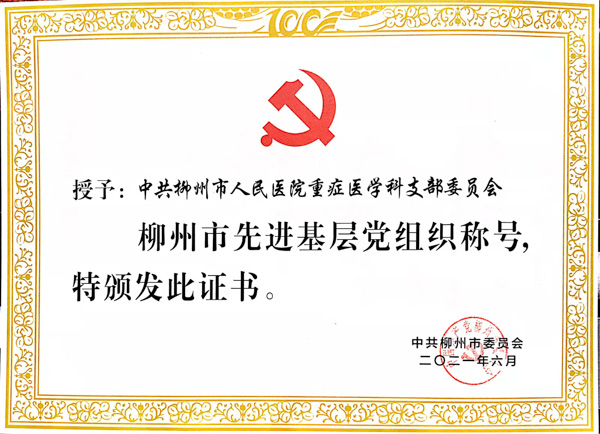 2021年恰逢中國共產黨建黨100周年,重癥醫學科黨支部始終保持五星黨支部的先進性,堅持以患者為中心,認真落實支部黨建工作主體責任,努力建強戰斗堡壘,榮獲2021年柳州市先進基層黨組織稱號。