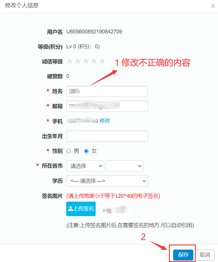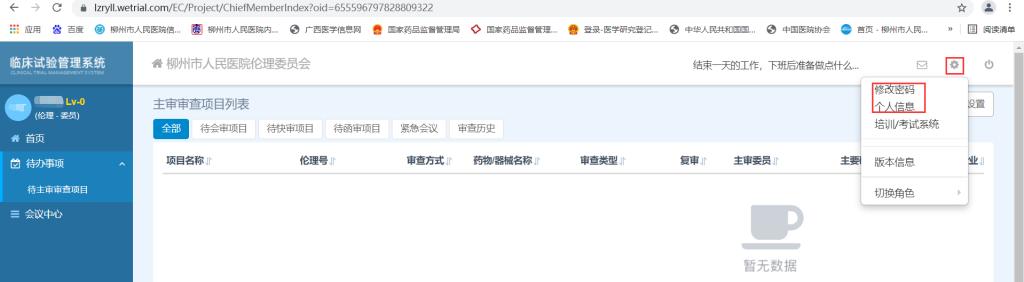 1.3修改密碼及個人信息:登陸系統后,單擊右上角的小齒輪圖標,選擇“修改密碼”或“個人信息”,按頁面提示修改密碼或個人信息,修改完成后單擊“保存”,即完成密碼或個人信息修改。(如下圖)