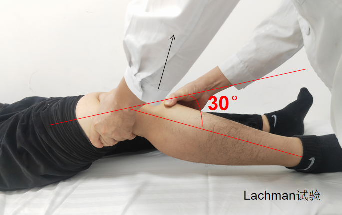 1.體格檢查:Lachman試驗: 患者平臥,屈膝20°~30°,足置于床上。檢查者一手抓住患者的股骨下端,一手抓住脛骨上端做方向相反的前后推動。如有超過健側的向前移動,則應視為陽性。