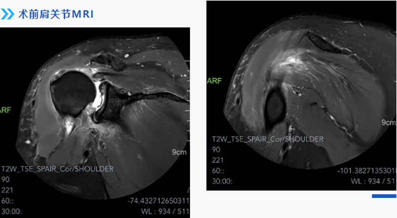 經過多方打聽,張師傅慕名來到柳州市人民醫院運動醫學科就診。運動醫學科主任韋釗嵐博士結合患者實際情況,仔細查體及閱片后給出了明確診斷:巨大肩袖撕裂,腋神經損傷(后上型巨大肩袖撕裂回縮導致神經牽拉)。