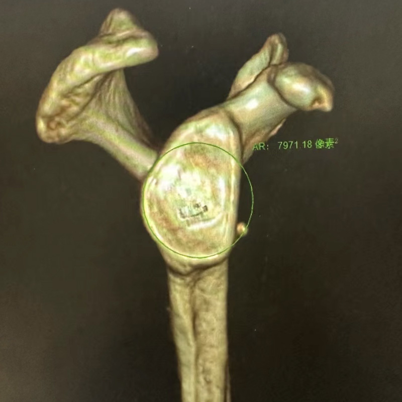 術中,創傷骨科團隊在患者髂骨處做3cm的手術切口取出2*1cm的全皮質髂骨骨塊,并用帶袢鋼板穿線打結固定,作為肩胛盂植骨準備;隨后,運動醫學科團隊在關節鏡下行肩關節盂唇+關節囊緊縮縫合術,將肩關節盂骨床新鮮化后,用鋼板把肩胛盂前下方髂骨植骨袢固定。