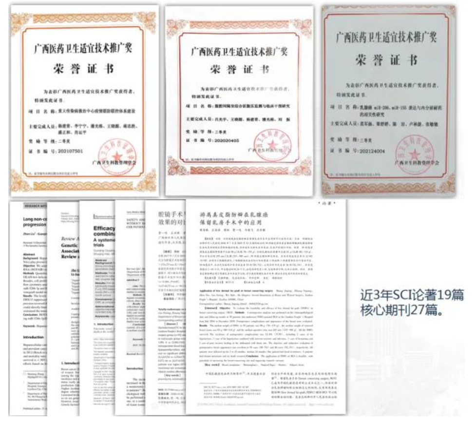 學術研究以微創醫學、精準醫療、器官移植、規范診療、腫瘤早篩等為方向。數字化技術和3D打印融合,開展精準解剖肝切除,項目獲柳州市科技局重大項目計劃支持。肝癌的早期篩查、一級預防,建立了柳州市早期肝癌篩查網絡、生物樣本庫,項目獲柳州市肝癌研究重點實驗室創新建設項目支持。近三年發表論文152篇,SCI論文19篇(IF最高5.057),核心期刊27篇,在研課題39項,科研經費179萬余元。近5年來獲廣西科技進步獎1項,廣西醫藥衛生適宜技術推廣獎二等獎2項、三等獎3項。